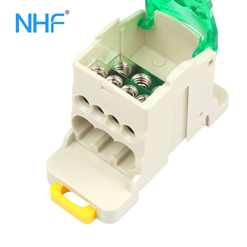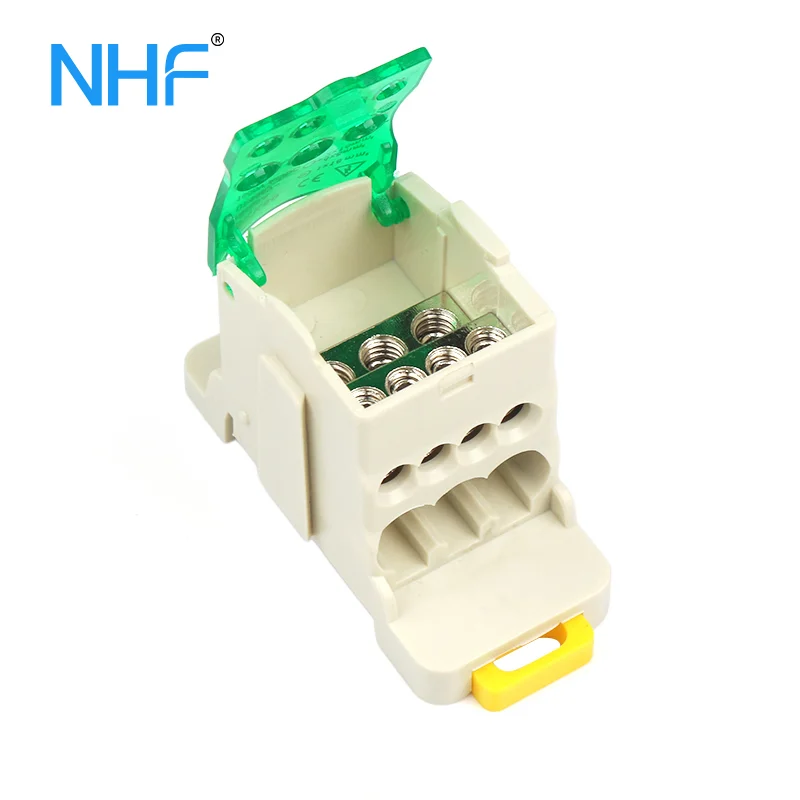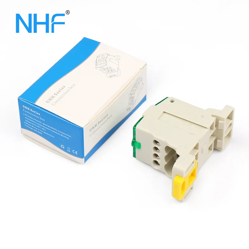 UKK 80A single phase distribution block with nickel-plated brass conductors, PA66 housing, 690V rating, CE/RoHS compliant, offering safe DIN rail or screw-mounted power distribution.
